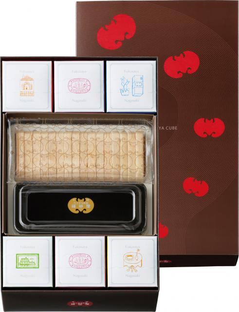 長崎といえば「カステラ」。 そのカステラといえば、創業 寛永元年、1624年から 本年395年を迎えるカステラの老舗「カステラ本家 福砂屋」です。今回ご紹介するのは「フクサヤキューブ・最中詰め合わせ」です。「フクサヤキューブ」は、季節によって色が変わるパッケージに、 熟練された職人によって焼き上げられた 伝統のカステラが2切れ入ったものになります。