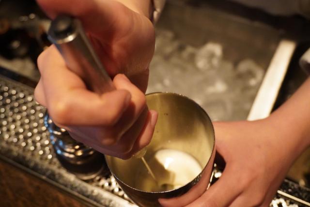 シェーカーに氷を入れてクリームがホイップするようなイメージで優しくシェイクしていきます