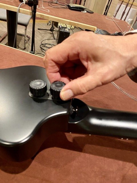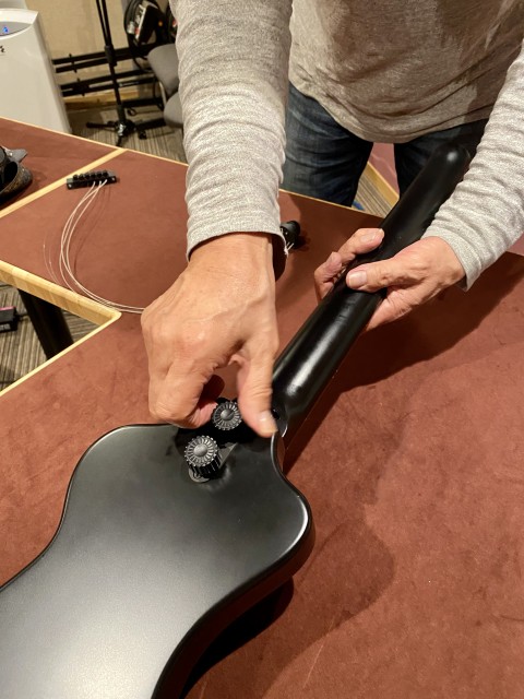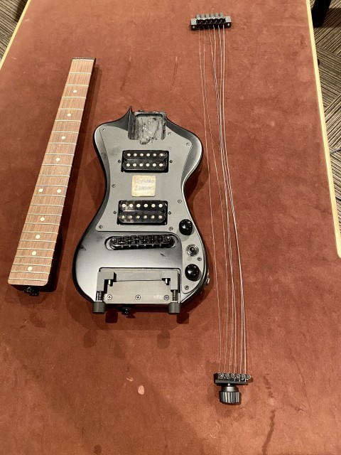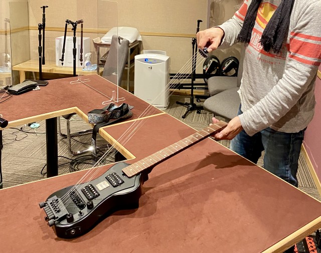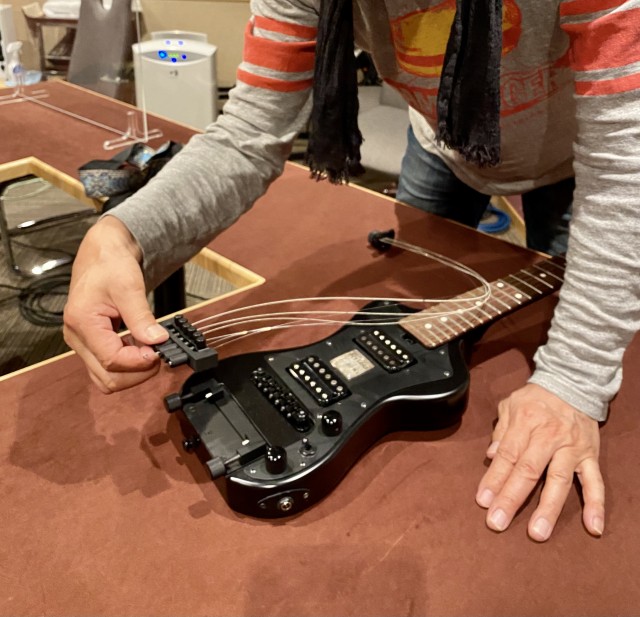 因みに今回、宇崎さんが弾いていたギターは持ち運びに便利な特注のエレキギターでした。収録後に分解してくれたのでパチリ!